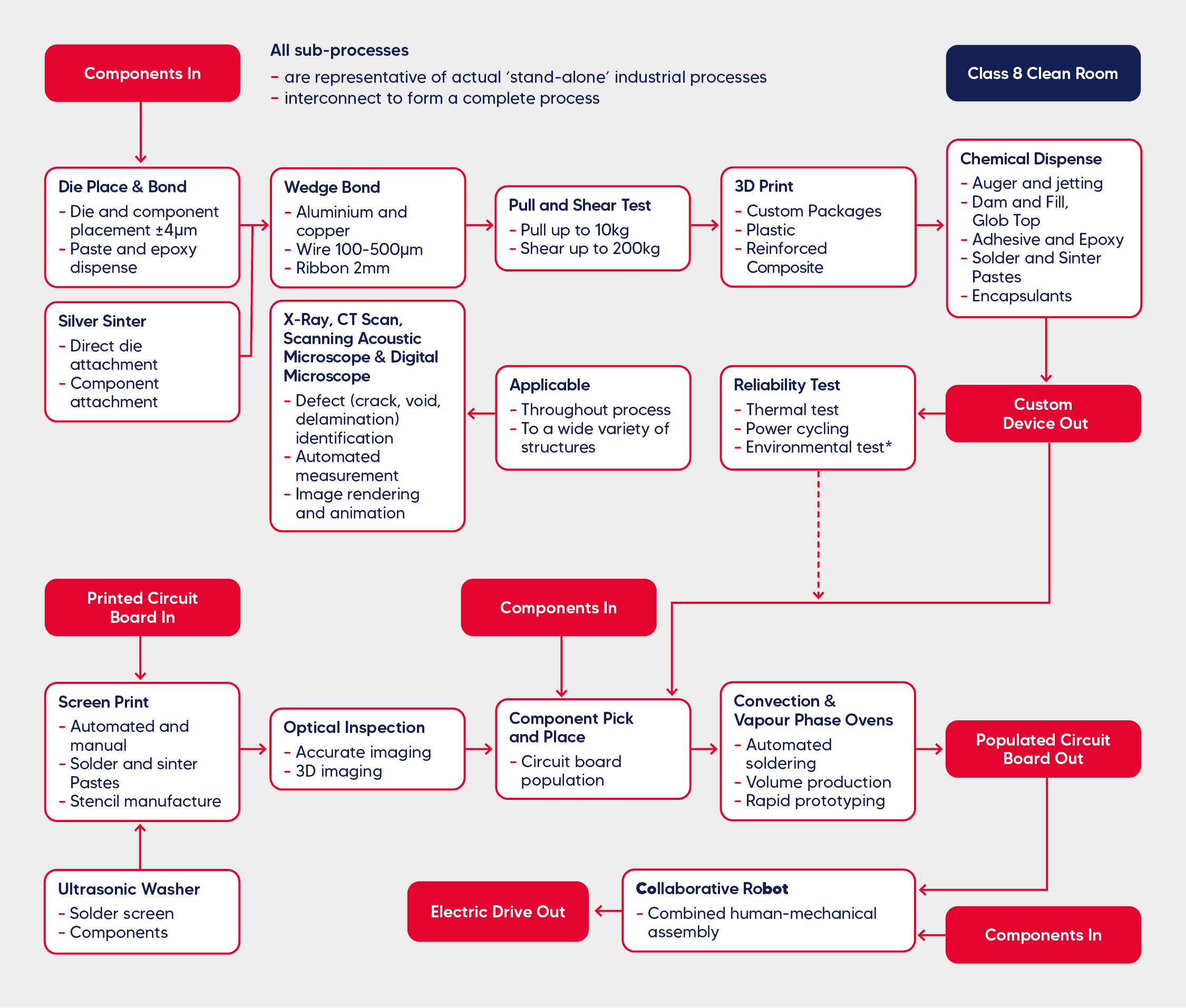Located within a cleanroom environment, state-of-the-art, flexible, industry-representative equipment enables custom packaging of silicon die, devices and circuitry, and surface mount circuit board manufacture and inspection, providing a platform for the development and scale-up of advanced manufacturing processes for highly-integrated power electronic systems. Specialist inspection and diagnostic equipment enables verification of manufacturing process quality.