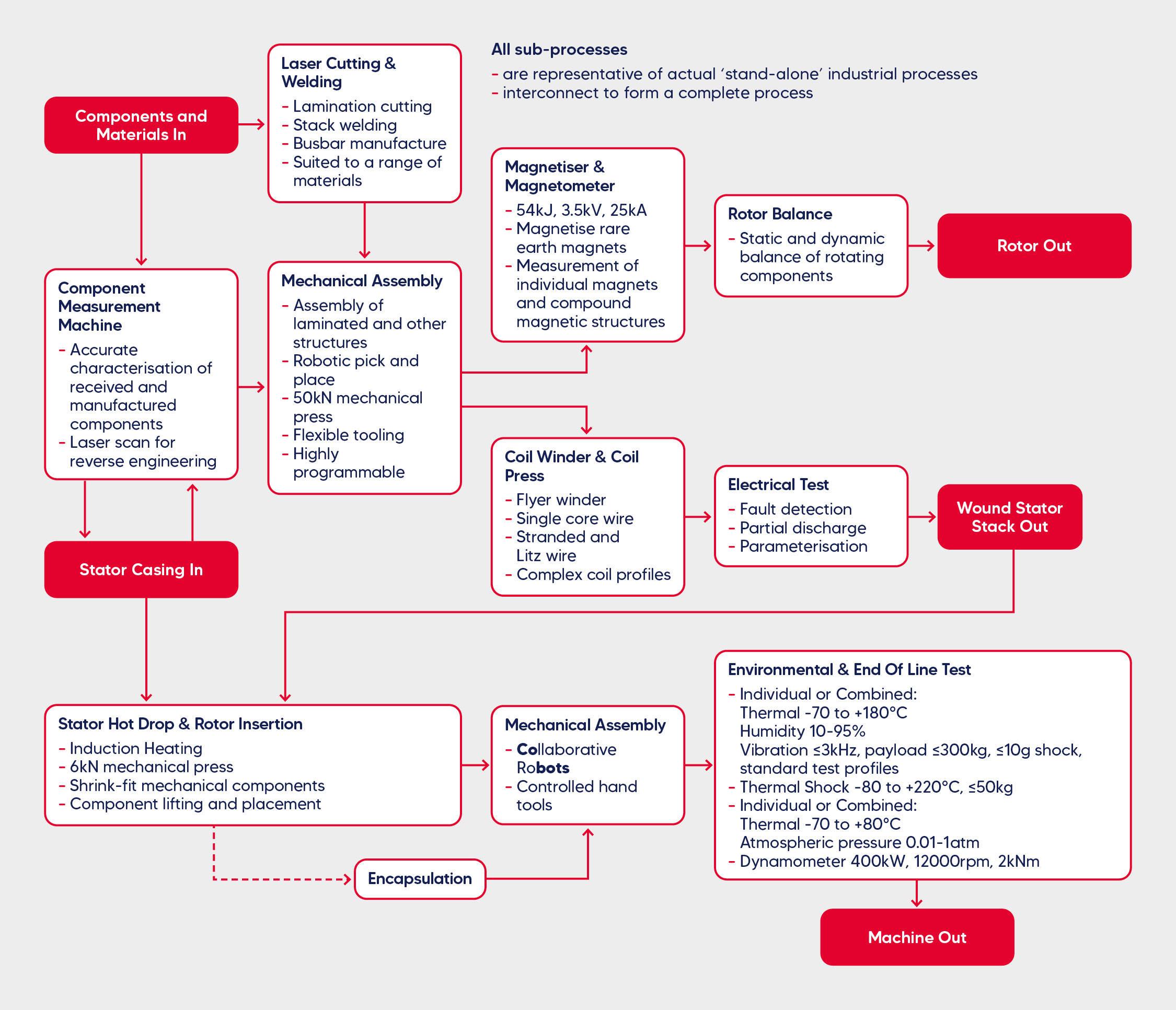 The Electrical Machines assembly line includes a range of flexible, automated assembly, and test and measurement equipment, providing an end-to-end platform for electrical machine manufacturing process development.